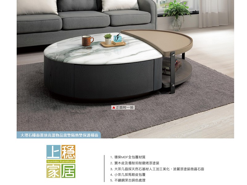 大茶几面採天然石基材加工美化,波麗漆塗裝微晶石面