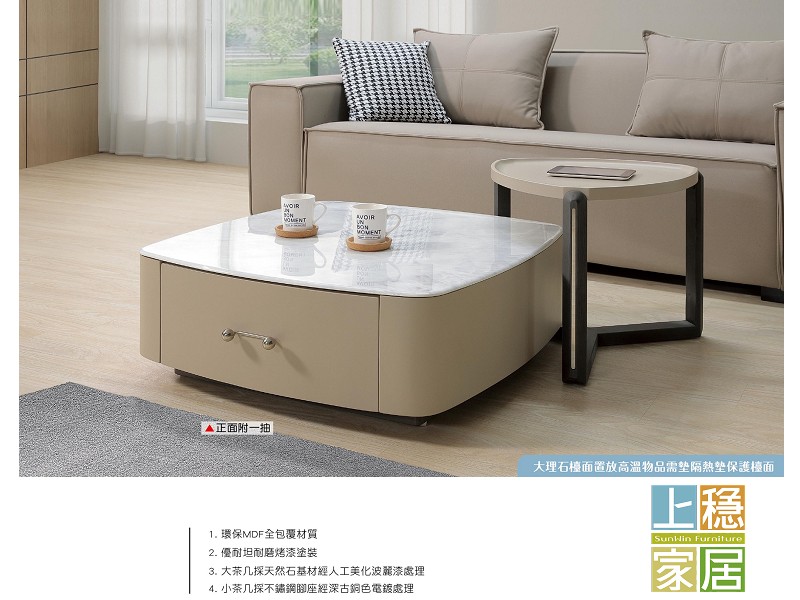 大茶几採天然石基材,經人工美化波麗漆處理