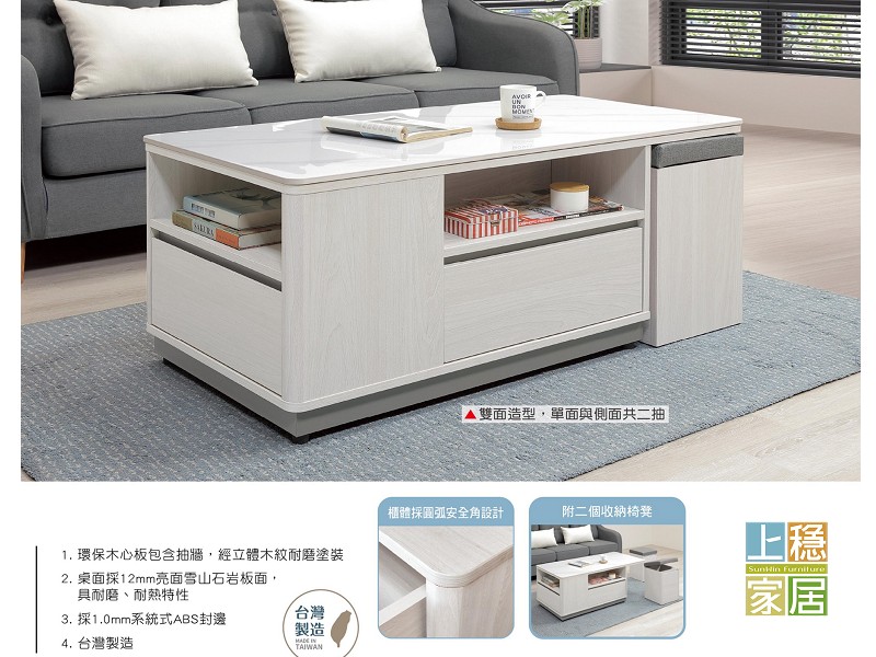 桌面採12mm亮面雪山石岩板面 具耐磨耐熱特性
