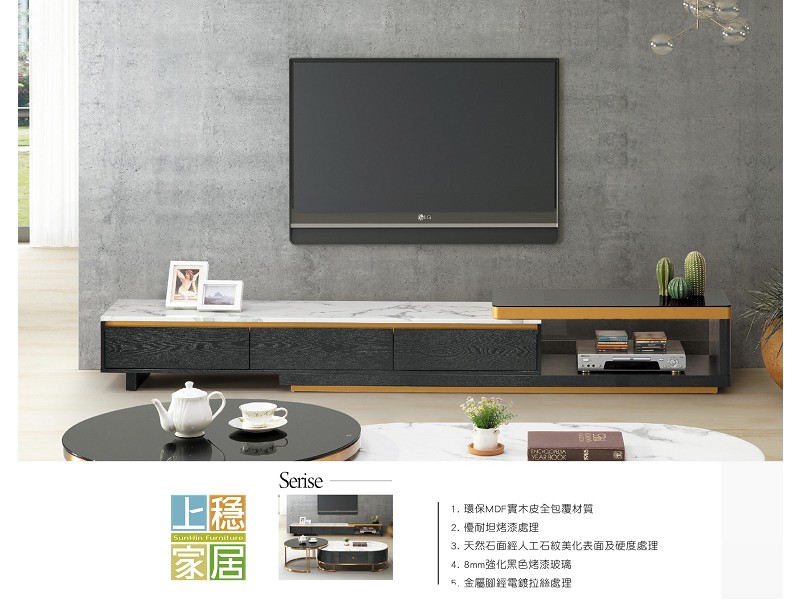環保MDF實木皮全包覆材質 優耐坦烤漆處理 天然石面經人工石紋美化表面及硬度處理 8mm強化黑色烤漆玻璃 金屬腳座經電鍍拉絲處理 --伯特赫石面6尺伸縮長櫃 寬180*深40*高36公分 (伸縮:180-250公分)