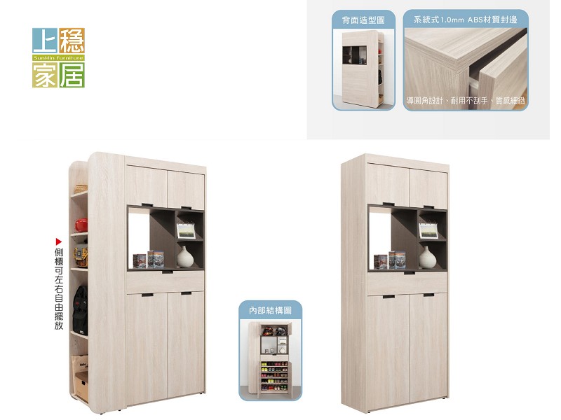 檯面 側板 抽牆採用台灣製造高級環保木心板 專利技術同調木紋鋼刷壓紋 猶如實木質感 採用系統式1.0mm厚ABS材質封邊處理 抽屜採用台灣製鋼珠滑軌 門片採用油壓緩衝鉸鍊 崁入式美背處理 全系列台灣製造 --利斯克3.7尺隔間鞋櫃(白原切) 寬110*深40*高200公分