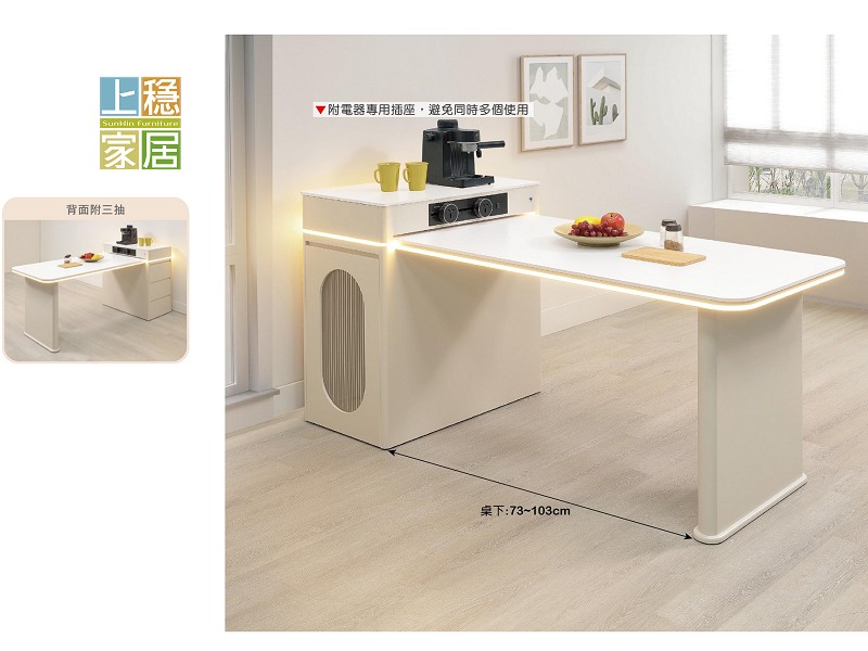 #島桌 環保MDF全包覆材質 優耐坦烤漆塗裝 桌面6mm岩板面 鋼珠滑軌 緩衝鉸鍊 附電器專用快拆插座 避免同時多個使用 --蘭達布5尺岩板伸縮島台桌 寬150-180*深80*高85公分 側櫃:寬45*深80*高85公分 桌面:寬105-135*深70*高72公分 (伸縮:150-180公分)