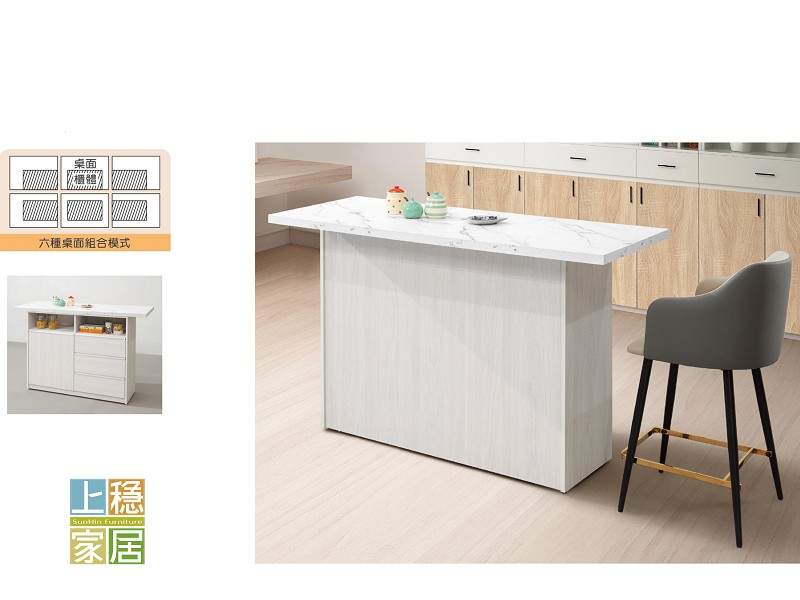 #吧檯中島 正面 側面木心板材質 PU耐磨塗裝 木紋經特殊立體化處理 增添木紋立體美感 檯面採美耐皿石紋耐磨材質 採系統式1.0mmABS厚封邊處理 質感加分 採鋼珠滑軌 門片採緩衝鉸鍊 台灣製造 可訂製
