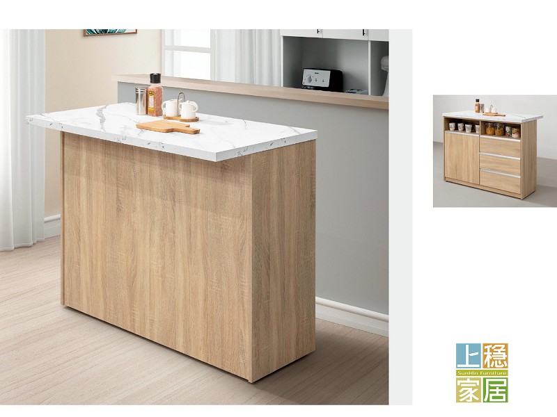 #吧檯中島 正面 側面木心板材質 PU耐磨塗裝 木紋經特殊立體化處理 增添木紋立體美感 檯面採美耐皿石紋耐磨材質 採系統式1.0mmABS厚封邊處理 質感加分 採鋼珠滑軌 門片採緩衝鉸鍊 台灣製造 可訂製