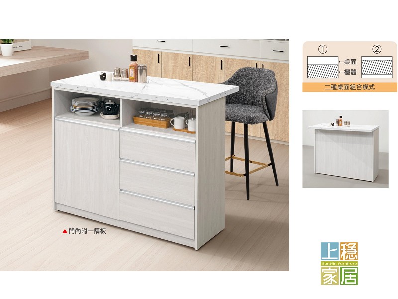 #吧檯中島 正面 側面木心板材質 PU耐磨塗裝 木紋經特殊立體化處理 增添木紋立體美感 檯面採美耐皿石紋耐磨材質 採系統式1.0mmABS厚封邊處理 質感加分 採鋼珠滑軌 門片採緩衝鉸鍊 台灣製造 可訂製