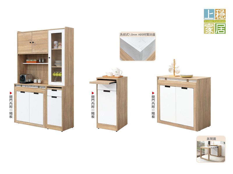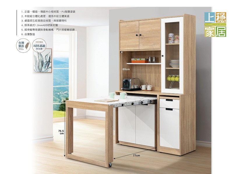 #餐桌櫃組 正面、檯面、側面木心板材質,PU耐磨塗裝 木紋經特殊立體化處理,增添木紋立體美感 採1.0mm ABS材質封邊處理 採鋼珠滑軌,門片採緩衝鉸鍊 台灣製造