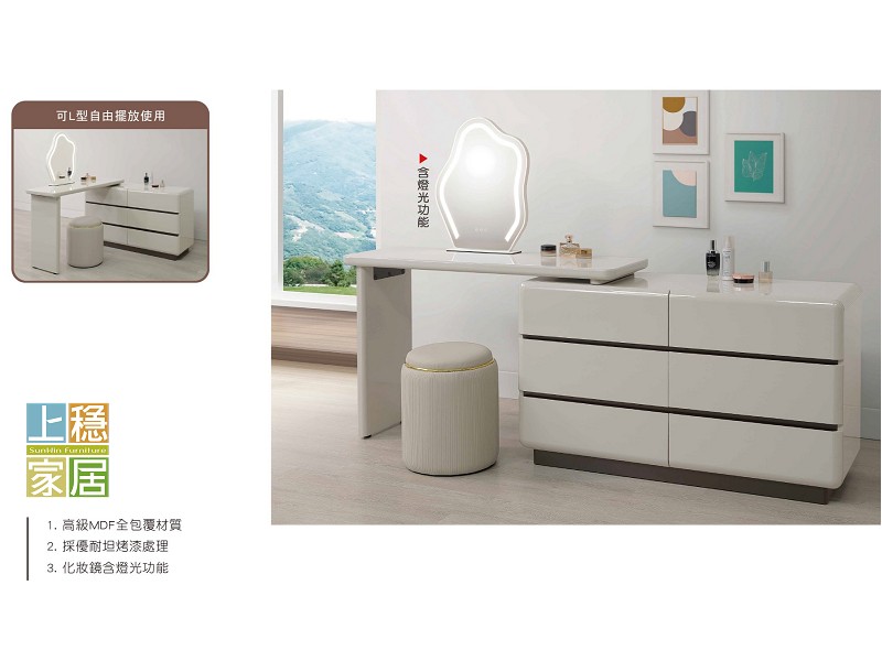 #化妝台 #鏡台 #梳妝台 高級MDF全包覆材質 採優耐坦烤漆處理 化妝鏡含燈光功能 --格尼艾4尺伸縮鏡台組(含椅) 桌面:寬120*深40*高76公分 六抽櫃:寬120*深42*高70公分 (左右自由擺放)