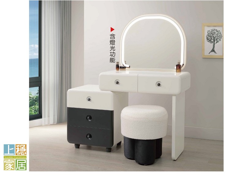 #化妝台 #梳妝台 #鏡台 高級MDF全包覆材質 採優耐坦烤漆處理 06腳座採金屬噴漆處理 化妝鏡含燈光功能 --馬艾2.7尺伸縮鏡台(含椅) 桌面:寬80*深40*高77公分 側櫃:寬50*深40*高60公分 (左右自由擺放)