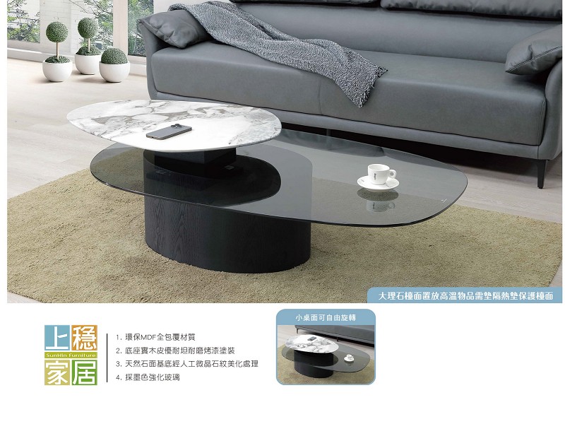 #旋轉茶几 環保MDF全包覆材質 底座實木皮優耐坦耐磨烤漆塗裝 天然石面基底經人工微晶石紋美化處理 採墨色強化玻璃 --連達伯旋轉功能茶几 大桌面:寬118*深79*高32公分 小桌面:寬80*深58*高41公分 (小桌石面可自由旋轉使用)