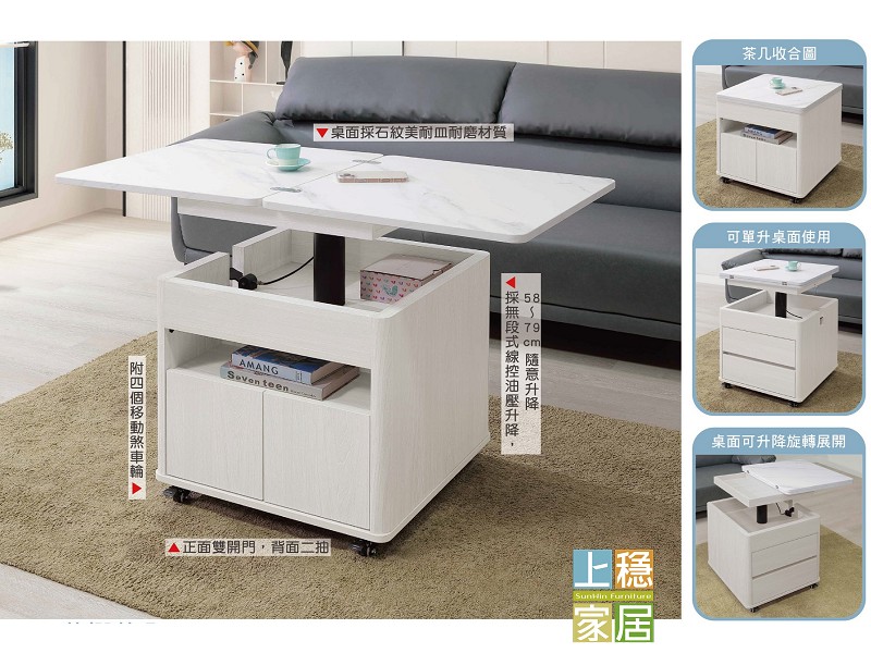 #升降茶几 正面 側板 抽牆為環保木心板 經立體木紋耐磨塗裝 桌面採美耐皿木心板材質 耐磨特性 採1.0mm系統式ABS封邊 採線控無段升降油壓桿 附四個煞車輪 台灣製造