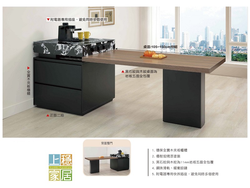 #伸縮茶几 環保全實木夾板櫃體 優耐坦烤漆塗裝 黑石紋與木紋為11mm岩板五面全包覆 鋼珠滑軌 緩衝鉸鍊 附電器專用快拆插座 避免同時多個使用 --旺斯6.1尺岩板伸縮島台桌 寬185-230*深80*高90公分 島台:寬80*深80*高90公分 桌面:寬105-150*深80*高75公分