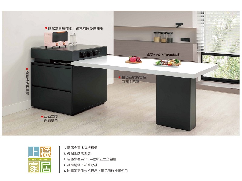 #伸縮茶几 環保全實木夾板櫃體 優耐坦烤漆塗裝 白色桌面為11mm岩板五面全包覆 鋼珠滑軌 緩衝鉸鍊 附電器專用快拆插座 避免同時多個使用 --斯萊6.8尺岩板伸縮島台桌 寬205-250*深80*高90公分 島台:寬80*深80*高90公分 桌面:寬125-170*深80*高75公分