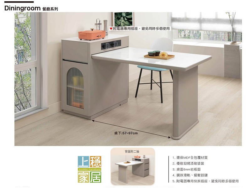 #伸縮茶几 環保MDF全包覆材質 優耐坦烤漆耐塗裝 桌面為6mm岩板面 鋼珠滑軌 緩衝鉸鍊 附電器專用快拆插座 避免同時多個使用 --柏安4.3尺岩板伸縮島台桌 寬130-170*深80*高91公分 島台:寬45*深80*高91公分 桌面:寬75-115*深70*高77公分