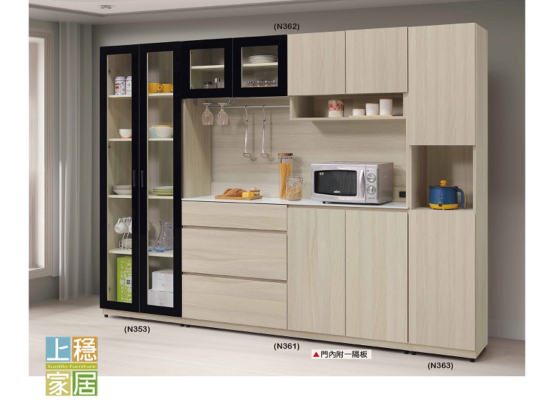 #收納櫃組 環保木心板包含抽牆 經立體木紋耐磨塗裝 桌面採12mm亮面雪山石岩板面 具耐磨 耐熱特性 採1.0mm系統式ABS封邊 採6mm強化玻璃黑色木框門 台灣製造 --達方系統式8.9尺收納櫃組(整組) 寬270*深40*高200.5公分