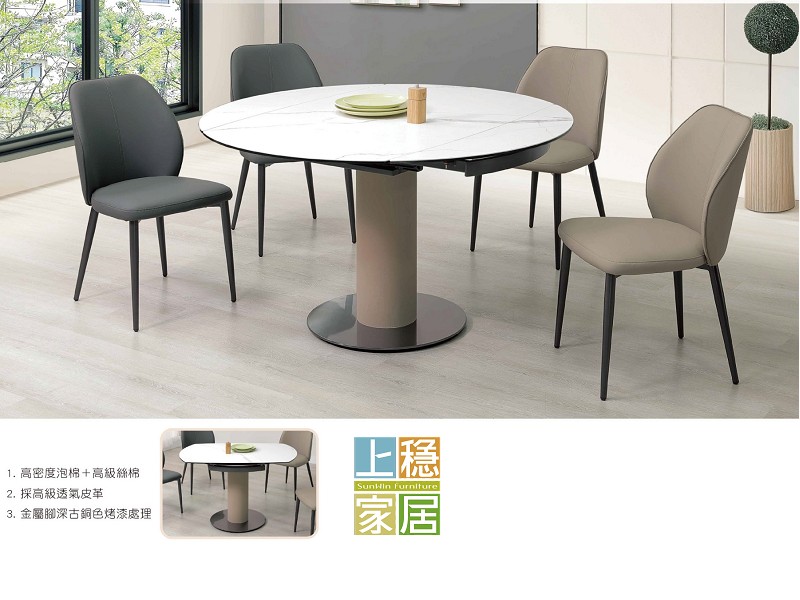 #伸縮餐桌 #陶板餐桌 #圓形餐桌 採3mm消光魚肚白陶板貼合8mm強化玻璃桌面 具耐熱抗污好清理特性 採出口專用五金伸縮架 金屬鐵片加工腳架 包覆馬鞍皮革 底座深古銅色防鏽處理 --卓山4尺複合陶板伸縮圓餐桌 展開:寬120*深120*高76公分 收合:寬120*深75*高76公分