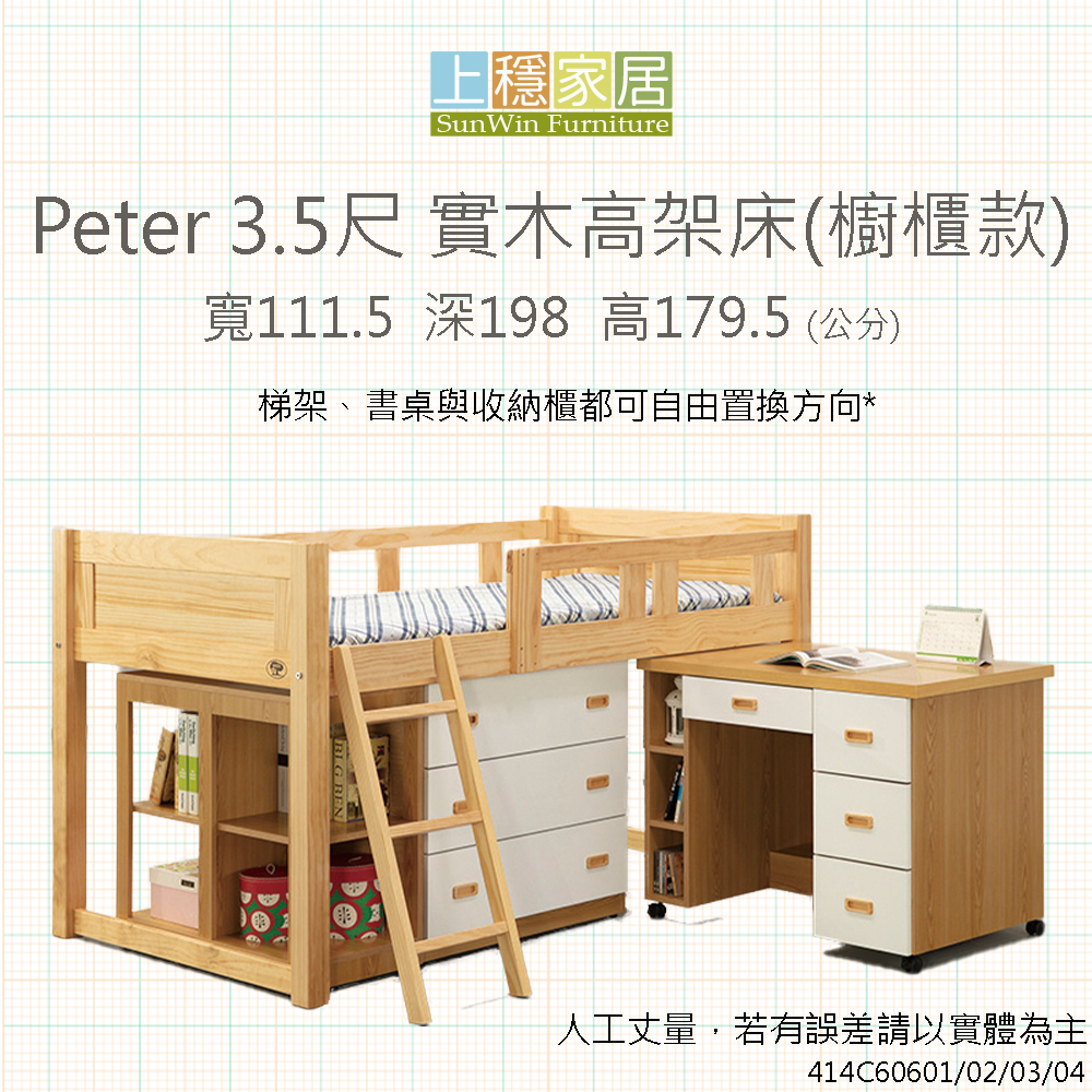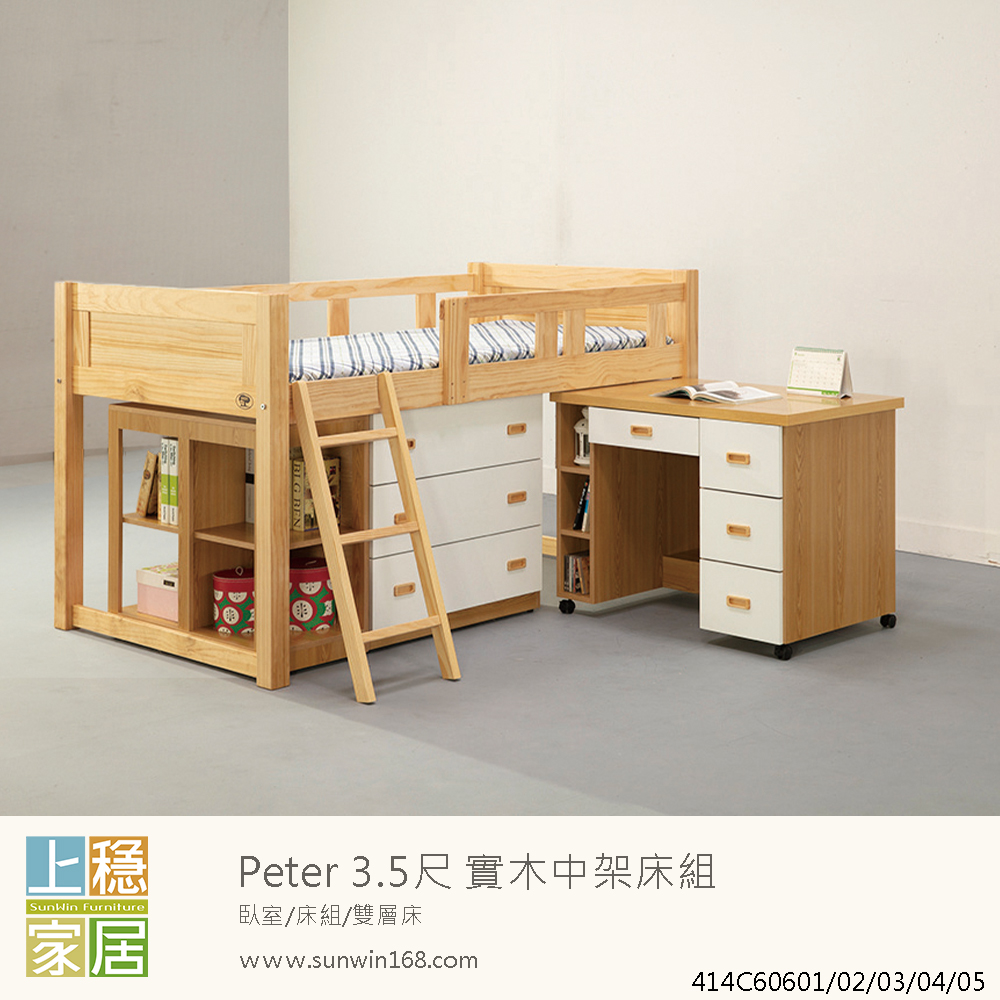 --Peter 3.5尺實木中架床組 $25400 中床:寬111.5*深198*高112公分 活動書桌:寬97.5*深64.5*高75.5公分 低收納櫃:寬80*深40.5*高75.5公分